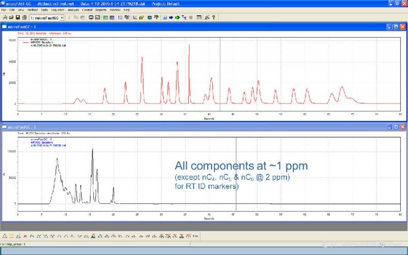 CALIDUSTM 微型超快速氣相色譜配置兩個氫火焰檢測器。在3分鐘內可以檢測非甲烷總烴和21個組分。檢測限低于5ppb。