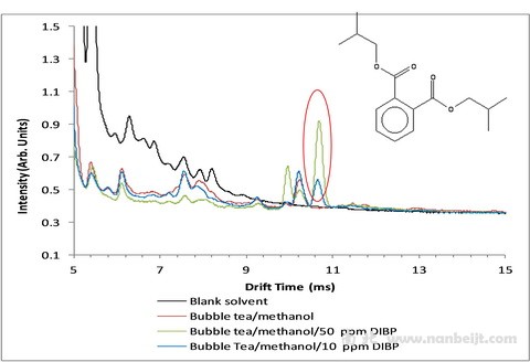 GA2100型電噴霧-高分辨離子遷移譜能夠用于食品中有害污染物的快速定性定量分析,例如12種酞酸酯的快速分析,具有很高的的選擇性和分離度,分析時間僅僅是十幾秒,遠遠優于液相色譜。檢測限是法規要求限量的三十分之一,但是樣品前處理遠遠比標準方法采用的前處理簡單。牛奶中三聚氰胺的檢測濃度可低至ppm。除了三聚氰胺之外,電噴霧-高分辨離子遷移譜還可以用于藥物,染料和激素的分析,分離度大于60。只需幾微升的樣品,檢測濃度可低至幾個納克。GA2100的優勢是分析速度快,樣品制備簡單,以及現場定性定量分析。