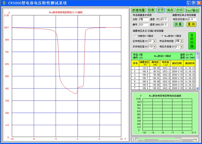 測試程序控制電容電壓特性測試測試儀進行測量并采集測試數據,把采集到的數據在計算機中加以分析,然后把測試數據以表格,圖形直觀地記錄、顯示出來。用戶可對采集到的數據在計算機中保存或者打印以備日后參考和查看,還可以把采集到的數據輸出到Excel中,讓用戶對數據進行各種數據分析。