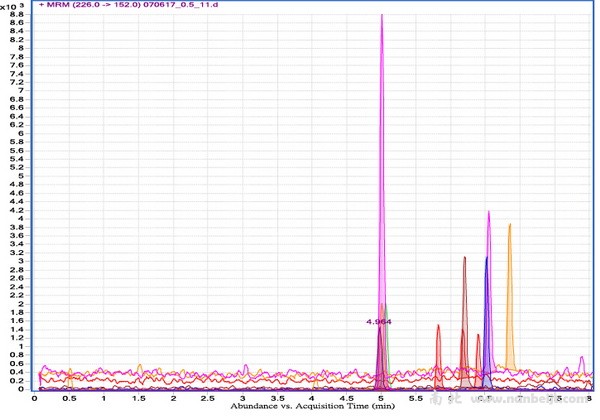 0.5ppb的β2-受體激動劑的MRM譜圖【十一種受體激動劑,特布它林,齊帕特羅,沙丁胺醇,塞曼特羅,萊克多巴胺,妥布特羅,克倫特羅(瘦肉精),溴布特羅,克侖潘特,馬布特羅和馬噴特羅】